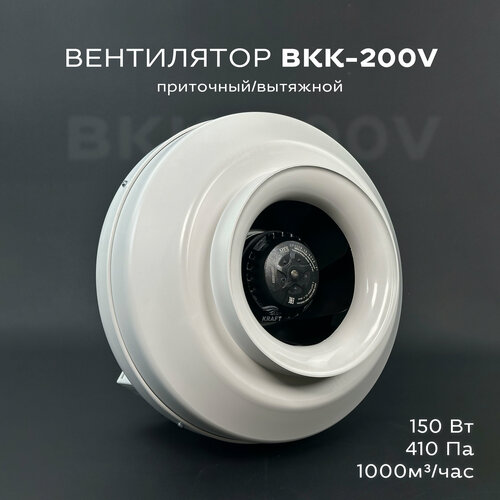 Вентилятор канальный круглый ВКК-200 V, 220В, 1000 м3 в час, 410 Па, 150 Вт, IP 44 для круглых воздуховодов диаметром 200 мм, вытяжной или приточный