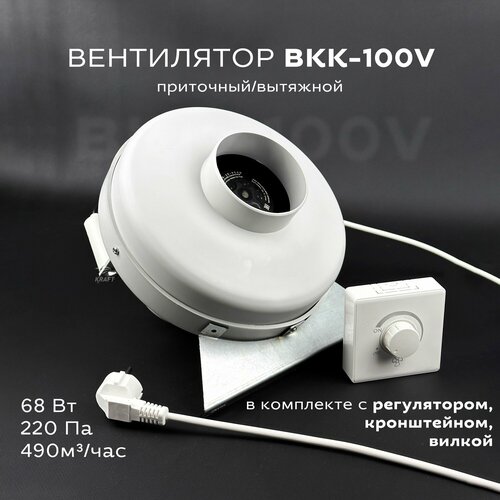 Комплект вентилятор канальный круглый ВКК-100 V с регулятором, вилкой, кронштейном, 220В, 490 м3/ч, 220 Па, 68 Вт, для круглых воздуховодов 100 мм вытяжной или приточный