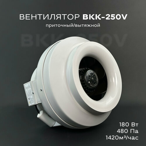 Вентилятор канальный круглый ВКК-250 V, 220В, 1420 м3 в час, 480 Па, 180 Вт, IP 44, для круглых воздуховодов диаметром 250 мм, вытяжной или приточный