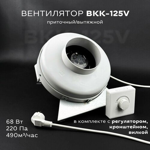 Комплект вентилятор канальный круглый ВКК-125 V с регулятором, вилкой, кронштейном, 220В, 490 м3/ч, 220 Па, 68 Вт, для круглых воздуховодов 125 мм вытяжной или приточный