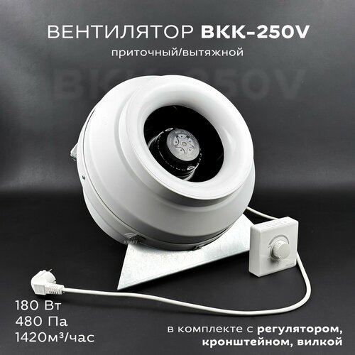 Комплект вентилятор канальный круглый ВКК-250 V с регулятором, вилкой, кронштейном, 220В, 1420 м3/ч, 480 Па, 180 Вт, для круглых воздуховодов 250 мм вытяжной или приточный