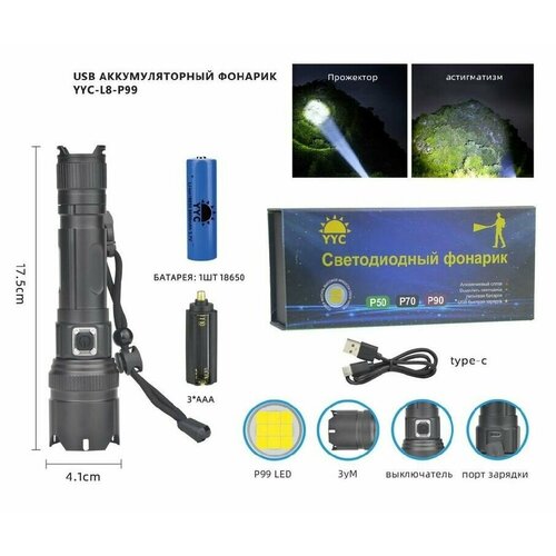 Фонарь светодиодный мощный, ручной, аккумуляторный, сверхъяркий, с боковой подсветкой, кемпинговый