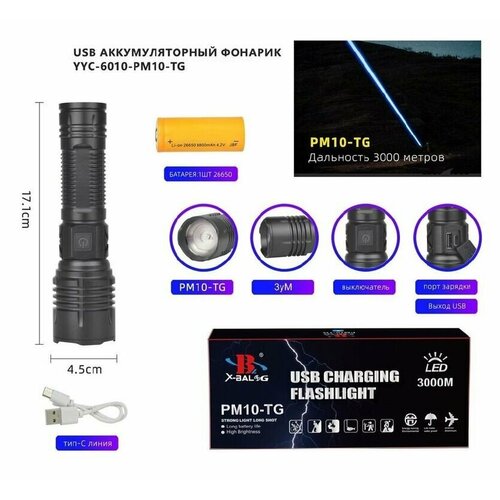 Фонарик аккумуляторный светодиодный - дальность 300 метров