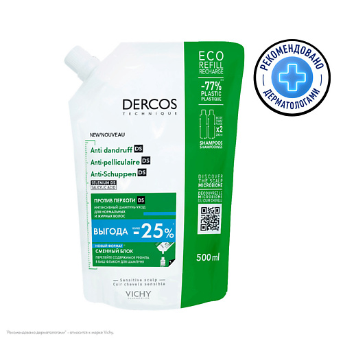 VICHY Dercos Интенсивный шампунь-уход против перхоти и себореи для нормальных и жирных волос, сменный блок