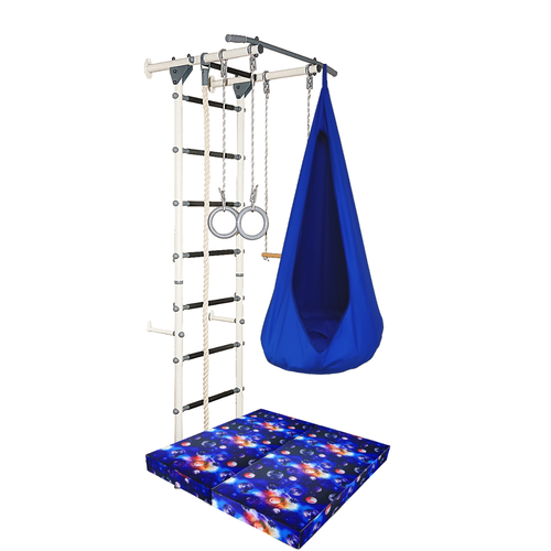 Комплектация:- шведская стенка- регулируемый турник- кольца гимнастические- канат х/б- веревочная лестница- мат гимнастический 1х1 м, толщиной 10 см, цвет серый- новинка! Гамак в новом насыщенном цвете понравится