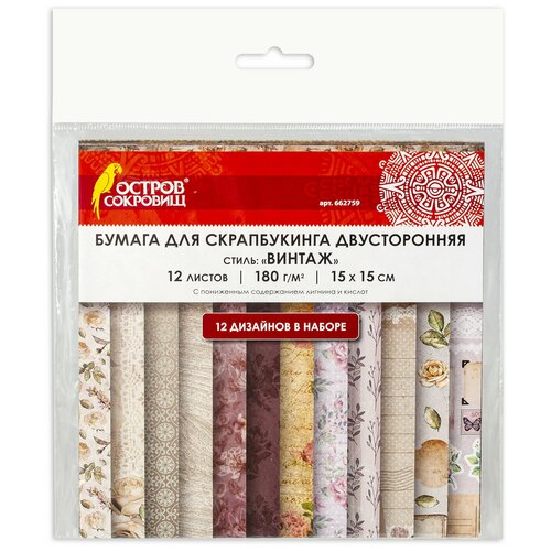 Остров сокровищ Бумага для скрапбукинга 15х15 см "Винтаж", двусторонняя, 12 листов, 12 дизайнов, 180 г/м2