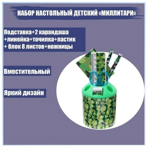 Набор настольный детский "Милитари" (подставка+2 карандаша+линейка+точилка+ластик+блокнот 8 листов+ножницы)