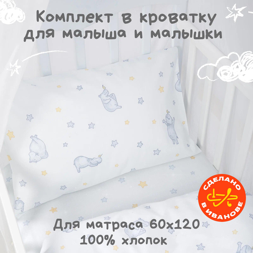 Детское постельное белье для новорожденных из 100% хлопка от торговой марки Ночь Нежна производство г. Иваново. Комплектация ясельного комплекта:- пододеяльник 140х110 см, с прорезью по нижнему краю изделия.- простыня 140х110 см, простынь без резинки, подойдет на овальный и прямоугольный матрас 60х120 см.- наволочка 40х60 см-1 шт, с клапаном 10 см. Если вы ищите качественный комплект постельного белья для малыша, то хлопковый комплект будет идеальным вариантом. Бязь - это ткань, изготовленная из натурального хлопка, которая обладает высокой прочностью и мягкостью, ткань приятная на ощупь, не скользит и не электризуется. Изделия полностью гипоаллергенны, поэтому их рекомендуют детям, беременным женщинам и аллергикам. Ткань дышит при этом впитывает влагу, сохраняя тепло. КПБ идеально подойдет как для лета, так и для зимы, обеспечивая Вашему ребенку комфортный сон. Наше предприятие производит ткани, используя современные технологии и гарантируя их высокое качество, а сама продукция сертифицирована и соответствуе