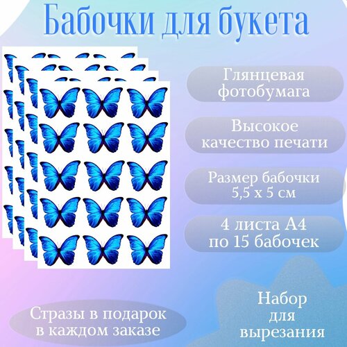 Бабочки синие на глянцевой плотной бумаге для вырезания и создания букета из бабочек и композиций