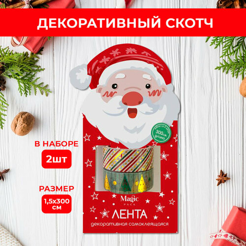 Декоративный скотч Magic Time для упаковки подарков Дед Мороз Лента декоративная самоклеящаяся длиной - 300 см, шириной - 1,5 см, 2 штуки в наборе