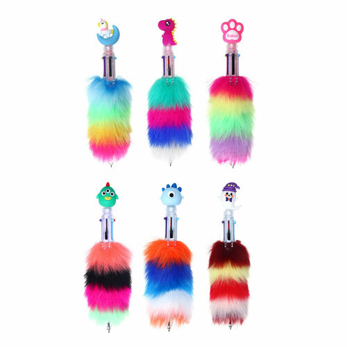 Всёгазин Ручка шариковая 6-цветная, "меховой" держатель, наконечник-фигурка, 17см, 6диз, ПВХ-бокс, 24 штуки