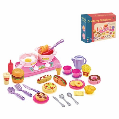 Игровой набор игрушечной посуды с плитой 13,5х20,5х3,5см и продуктами (можно резать) 35 предметов, подарок для девочки, TY2012P-2