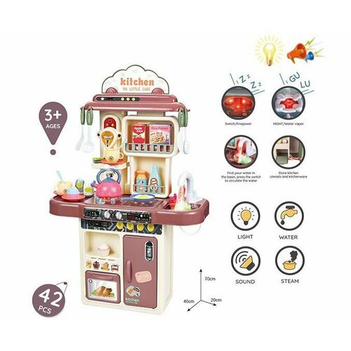 Большая детская игровая кухня с водой для девочек, высота 70 см, холодный пар, свет и звук, 42 предмета, 16860В/200833502