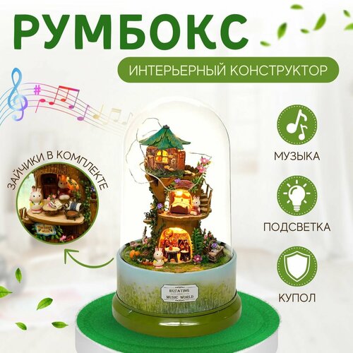 Музыкальный интерьерный конструктор с подсветкой "Домик в лесу" с зайчатами, румбокс, миниатюра DIY House, набор в подарок для детей и взрослых