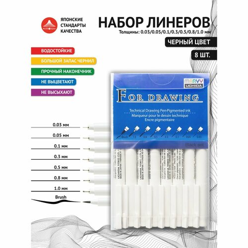 Набор черных линеров (капиллярных ручек) Marvy Uchida для черчения и рисования MAR4600 8 шт/уп.