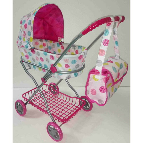 Коляска 9617 для кукол металлическая, складная, прогулочная, со столиком, с тентом, с корзиной, роз