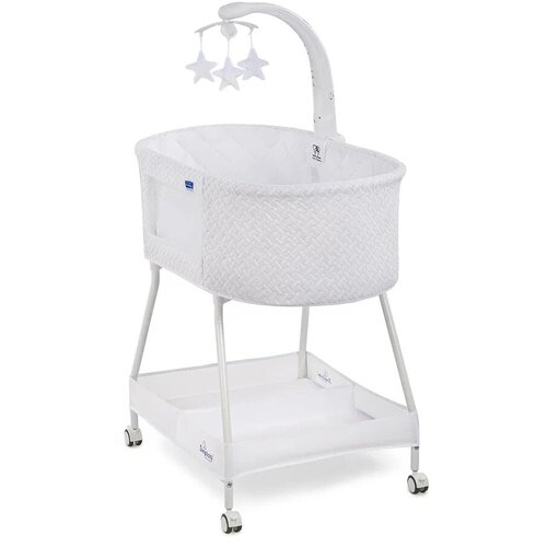 Внутри люльки находится плотный матрасик, в комплекте к которому предлагается простынка на резинке. Удобный складной капор колыбели позволяет укрыть малыша от прямого света, мягкие подвесные игрушки на его дуге способствуют развитию зрительного восприятия и развлекают ребенка. Внизу находится вместительная корзина для хранения игрушек и средств по уходу.