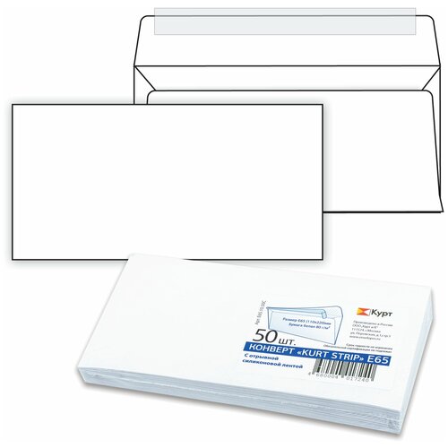 Конверты Е65 (110х220 мм), отрывная лента, белые, комплект 50 шт, внутренняя запечатка, Е65.10.50С