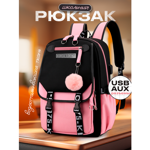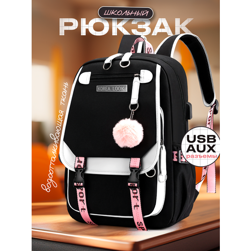 Городской школьный рюкзак с помпоном для учащихся (Черно-розовый)