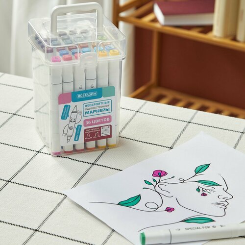 Всёгазин Набор маркеров худож, 36 цветов, 2-сторонний (скошенный 6мм + круглый 2мм), в пласт. боксе