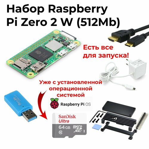 Набор-комплект Raspberry Pi Zero 2 W + micro sd 64gb + блок питания от rpi + металлический корпус / микрокомпьютер расберри
