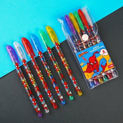 Набор гелевых ручек с блёстками, 6 цветов, Человек-паук