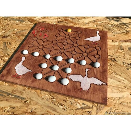 Настольная игра " Лиса и гуси ", доска 30 см* 30 см и фишки 22 шт, дерево/ керамика , ручная работа.