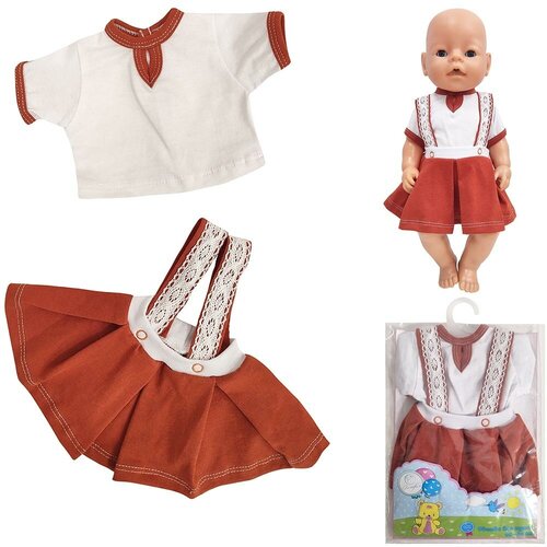 Платье и бриджи, ростом 38-43 см. Изготовлено из качественного трикотажа. Приятно на ощупь. Не имеет неприятного запаха, не " красится", в руках ребёнка. Кукольная одежда упакована в прозрачную упаковку из ПВХ, с вешалкой и этикеткой. Вы сможете использовать вешалку, для вашей кукольной одежды.