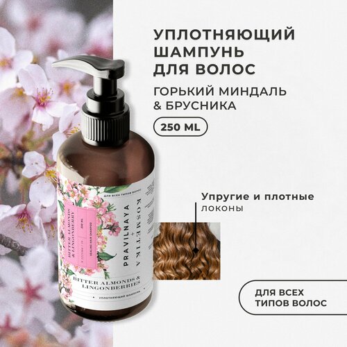 Уплотняющий шампунь для всех типов волос Pravilnaya Kosmetika, питательный с пантенолом, Горький миндаль & Брусника, 250 мл.