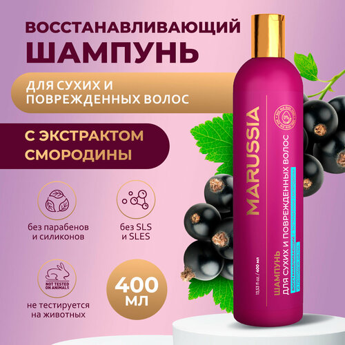Marussia Шампунь для сухих и поврежденных волос женский мужской восстанавливающий, с экстрактом смородины и пептидов шелка, 400 мл