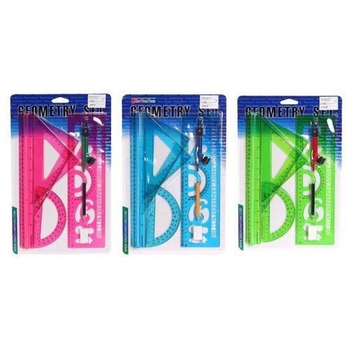Набор геометрический, чертежный, блистер: линейка 30 см, 2 треугольника, транспортир, ластик, циркуль, линейка с трафаретами, тонированный, микс