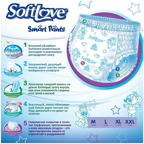 Подгузники-трусики "Softlove Smart Pants"Size-M (6-9 кг) 60шт голубой, бирюзовый, размер 3