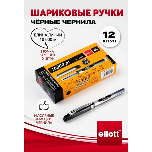 Ручки шариковые черные Ellott 10000 м, набор 12 штук, толщина линии 0,5 мм