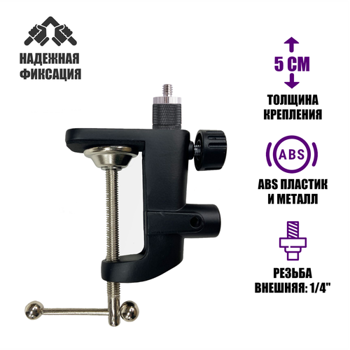 Характеристики:- Материал: ABS пластик, металл;- Нагрузка: 800 г;- Зажим струбцины: 4,6 см;- Ширина: 7,2 см;- Высота: 5,8 см;- Резьба внешняя: 1/4.