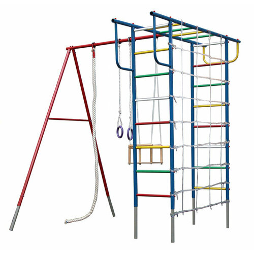 Комплектация:• Металлический каркас.• Металлические перекладины лестниц.• Гимнастический мат складной 125 х 95 х 4 см. • Фанерная горка с мягкими бортиками.• Качели верёвочные детские.• Лестница верёвочная (6 ступеней).• Кольца гимнастические.