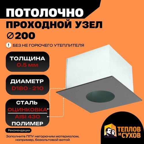 Потолочно проходной узел для дымохода 200, ППУ AISI 430 и Оцинковка 0.5 мм, экран черный полимер, прохода перекрытия