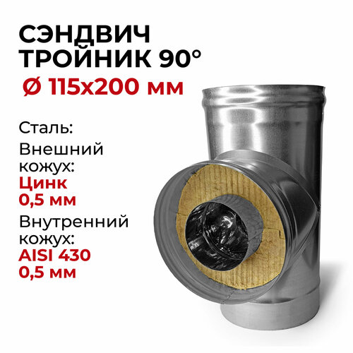 Сэндвич тройник термо для дымохода утепленный 90 градусов d 115x200 мм (0,5/430*0,5/Цинк) "Прок"