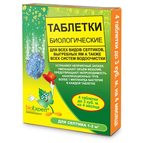 Expert в виде шипучих таблеток. Упаковка из 4 таблеток рассчитана на объем септика до 16 куб м. Средство содержит живые бактериальные культуры, необходимые минералы и органическую питательную среду. Бактериальные штаммы, входящие в состав таблетки, безопасны для людей и окружающей среды. Область применения: выгребные ямы, автономные канализации, приусадебные сточные станции, индивидуальные канализационные стоки (в особняках, сельских хозяйствах, дачных домиках и др.), индивидуальные сточные системы (школы, трактиры, гостиницы, парки и др.) Каждая таблетка содержит более одного миллиарда активных безвредных микроорганизмов преимущества препарата: превращает содержимое септиков в жидкое состояние, освобождает дренаж в придомовых очистительных системах и облегчает распределение содержимого дренажа, снижает расходы на вывоз и чистку септика, удаляет отложения в канализациях, удаляет неприятные запахи. Очень эффективное средство: 1 таблетка содержит миллиард б