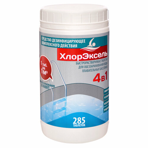 Комплексное средство для бассейнов Кристалпул ХлорЭксель, таб. 3,5 г, банка 1 кг, 4 в 1