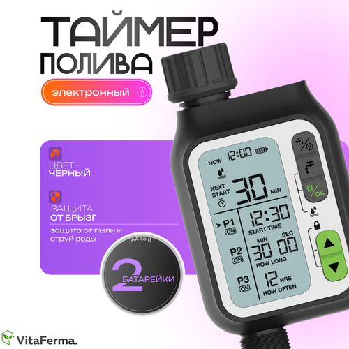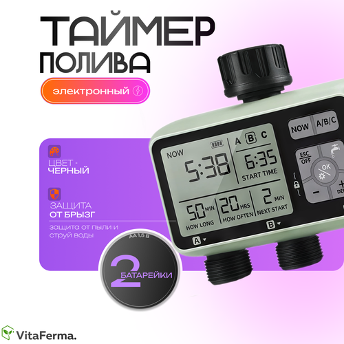 Ferma – это двухканальный инструмент, который позволит вам управлять поливом с легкостью и точностью. С помощью этого устройства вы сможете гибко настраивать режим полива для различных зон, устанавливать время и интервал между поливами и задавать 3 режима работы. Контроллер обладает водонепроницаемостью IP55 и защитой от протечек, что гарантирует безопасность и надежность его работы. В комплекте идут 2 резьбовых адаптера, 2 уплотнительных ленты и подробная инструкция. С VF-SG