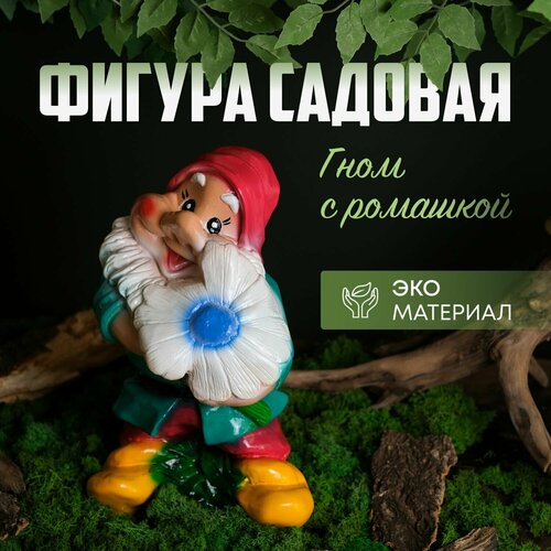 Фигура декоративная садовая Гном с ромашкой высота 34 см, декор для сада, дачи и огорода на газон