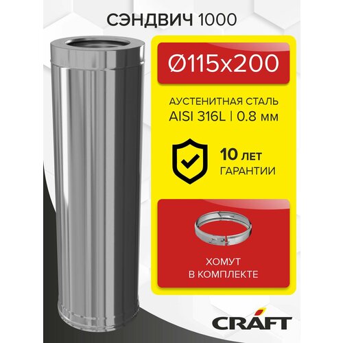 Элемент дымохода Сэндвич труба 1000 Craft HF-50B (316/0,8/304/0,5) Ф115х200