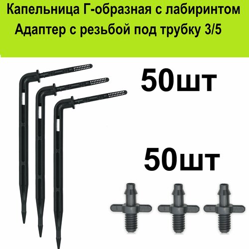 Капельница стрелка Г-образная 10см. (50шт) + резьбовой адаптер под трубку 3/5мм для капельного полива растений в теплице самотеком от бочки