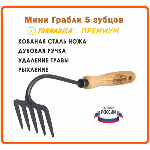 Мини грабли 5 зубьев Премиум Торнадика дубовая рукоятка 14 см. / Грабельки садовые Tornadica