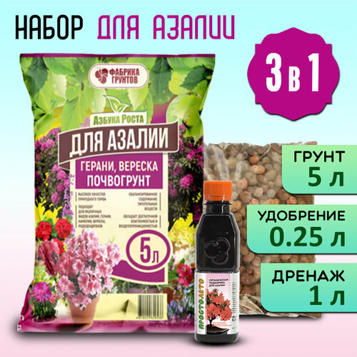 Набор для Азалий, Герани и Вереска. Грунт цветочный (5 л), минеральное Удобрение, Дренаж