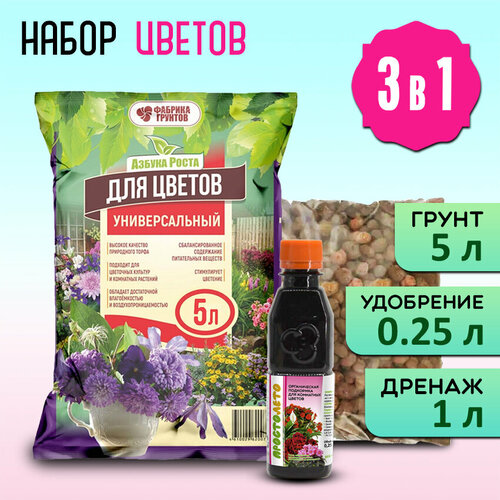 Набор для пересадки цветов - Грунт универсальный (5 л), Удобрение, Дренаж