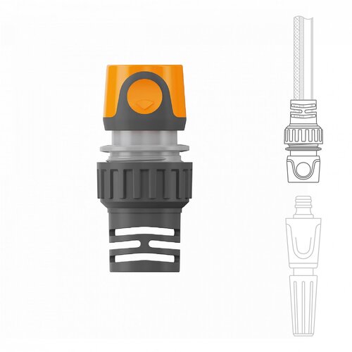 ABS, пластикКоннектор позволяет быстро подключить шланг к разбрызгивателю или другой насадке. Надежный замок и жесткая металлическая пружина обеспечивают плотную фиксацию штуцера, что исключает протекание воды в соединении. Функция "Аквастоп" обеспечивает автоматическое отключение подачи воды при отсоединении от шланга или смене насадки.