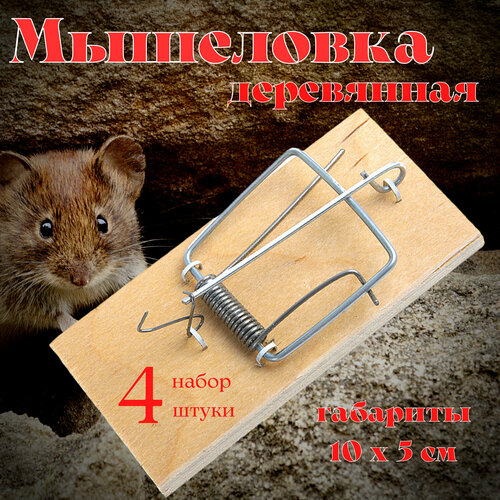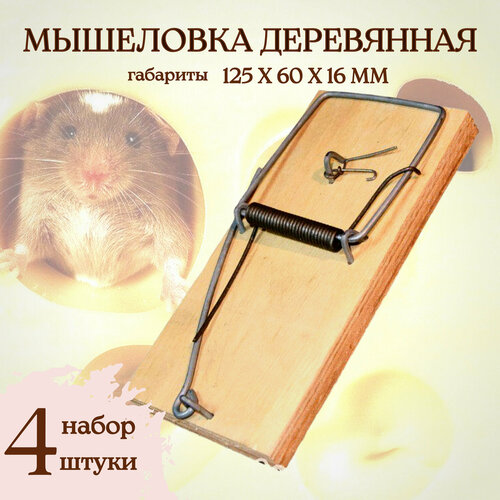 Мышеловка деревянная, 10x4.5x0.6см, 4 шт, с классическим проверенным пружинным механизмом для ловли мелких грызунов, наносящих вред садовым растениям и деревьям, дому и вещам в нем.