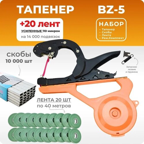 Тапенер для подвязки растений BZ-5 (BZ-V) + 20 зеленых лент + скобы Агромадана 10.000 шт / Подвязчик для растений