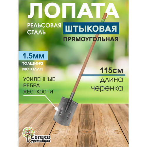 Лопата штыковая с черенком рельсовая сталь прямоугольная с ребрами жесткости `Урожайная сотка` садовая